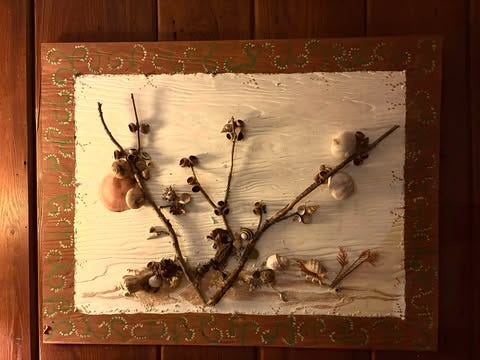 I am in possession of a piece of folk art created by my great aunt Pearl, who was a naturalist. Using materials collected on her many hikes and voyages, Aunt Pearl made collages, including a massive one that has hung over the sofa at the cottage all my life. It was a big piece, with lots of seashells, dried mushrooms, bits of moss and strange roots and seeds. When I was a child, I took naps under it, and looking up at it with sleepy eyes, I imagined it was the island on which The Tempest was set, complete with Caliban’s cave, and stormy seas. Over the last many years, the collage has fallen apart, literally, as pieces came off it and got swept up and discarded.